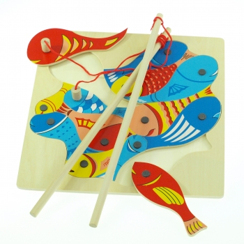 Magnetska ploča sa drvenim ribicama koje se pecaju magnetskom udicom. Osim izazova upecati sve ribic